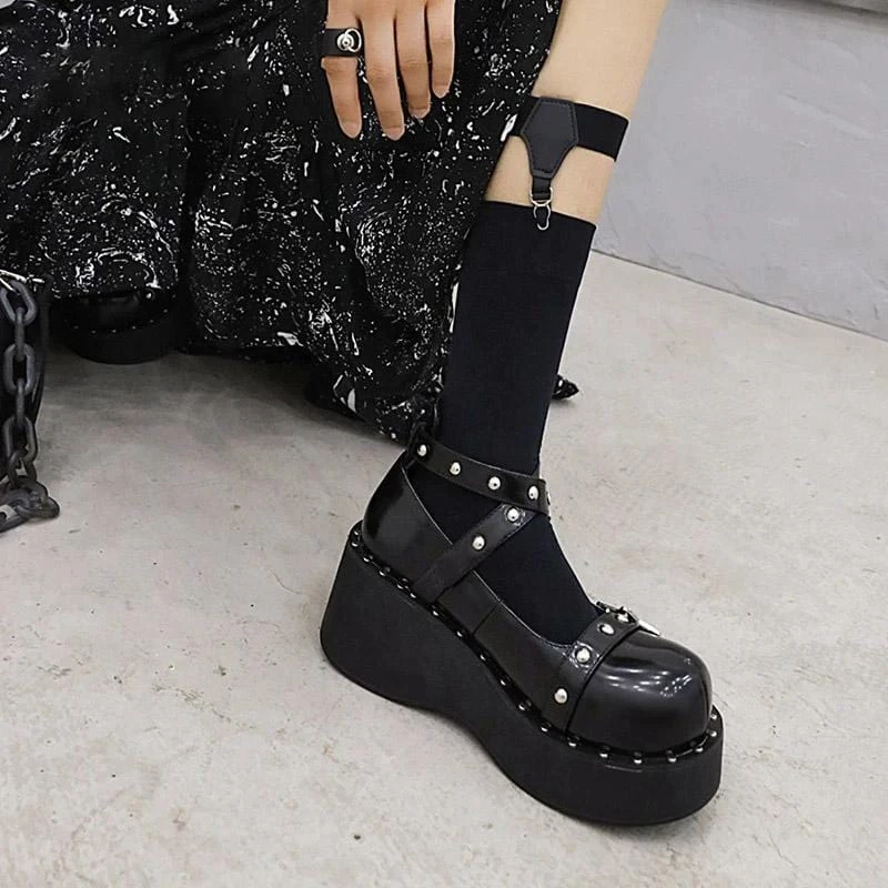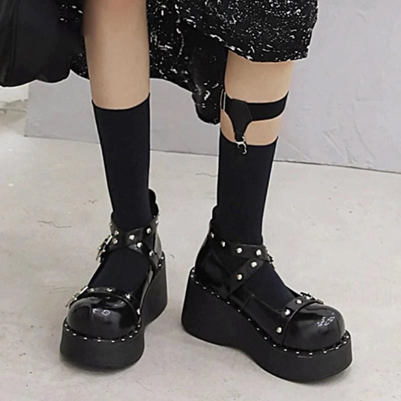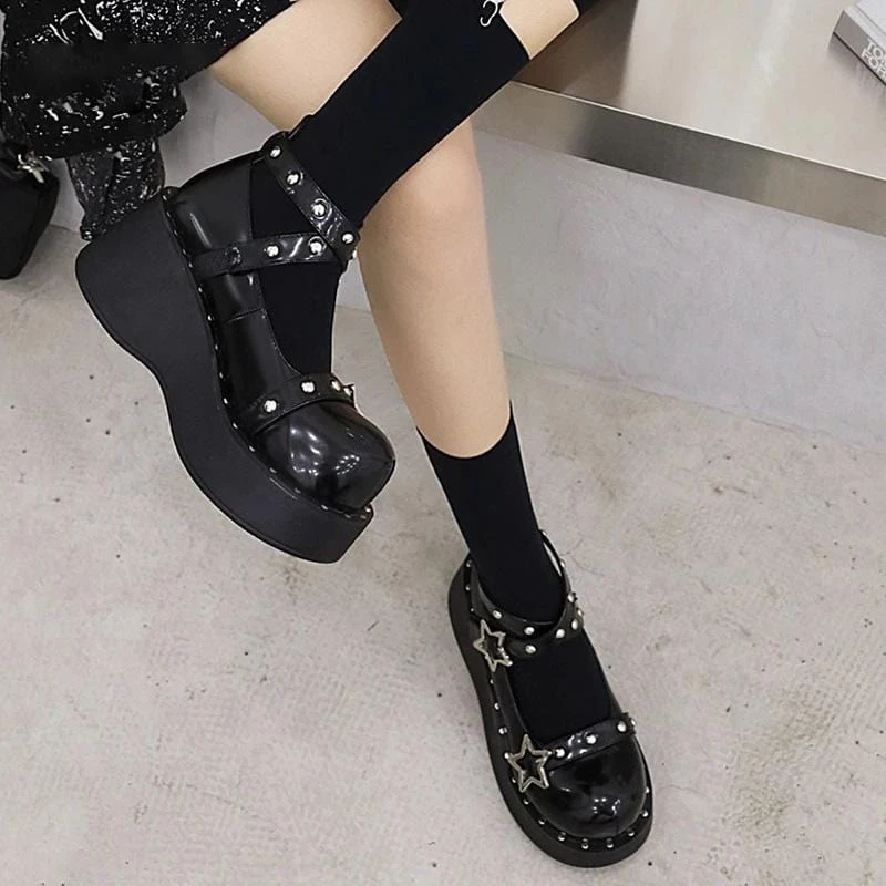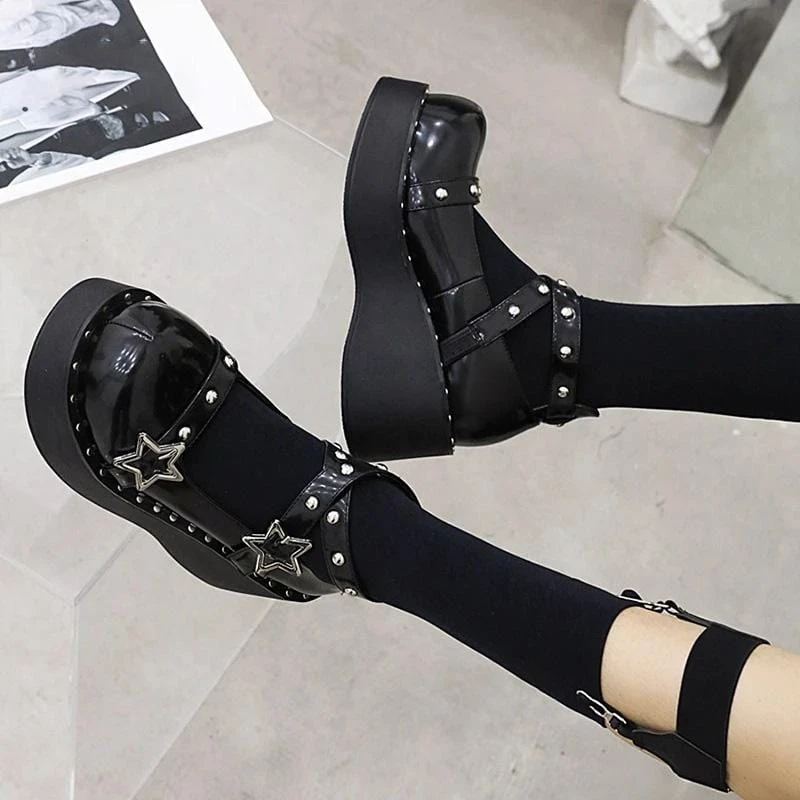 Cuz you’re one with the moonlight. These patent Night Star Mary Jane Shoes have a vegan leather construction, completely studded with heavy metals, a criss-cross strap design, and adjustable star-shaped buckle closures.