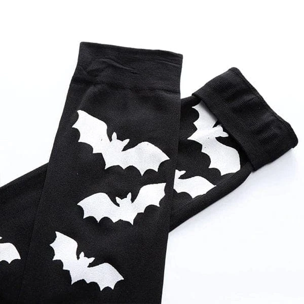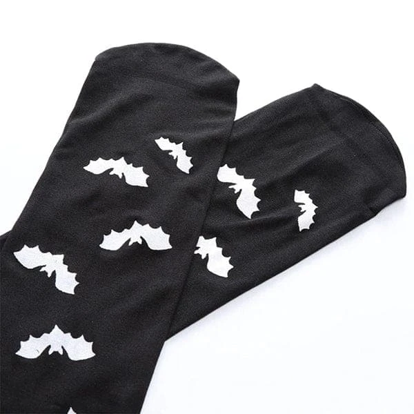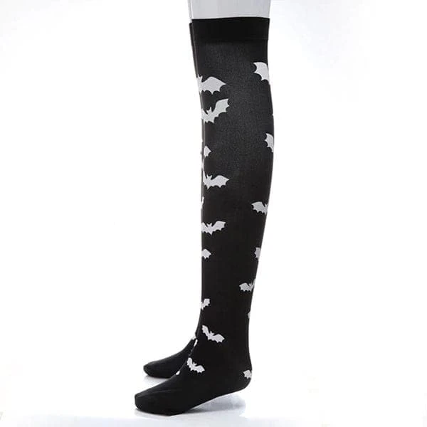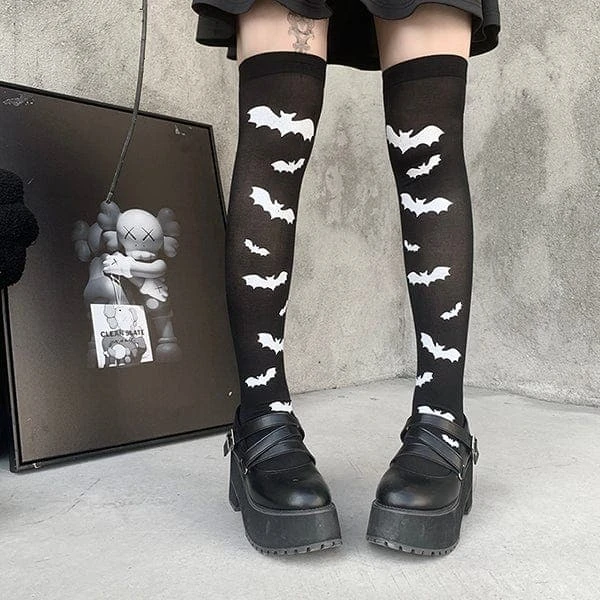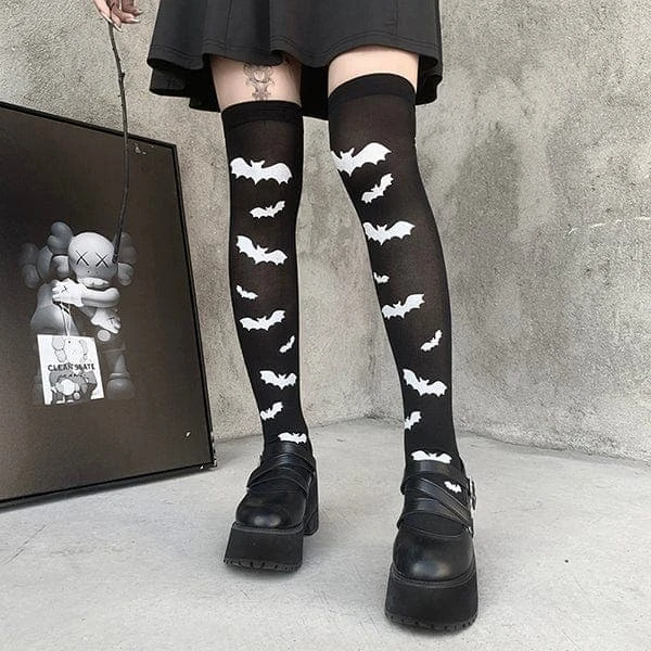 Every spooky cutie needs a fabulous pair of gothic bat socks that go over the knee! These socks are made of thin cotton polyester blends with bat prints so creepy cute and perfectly haunting.