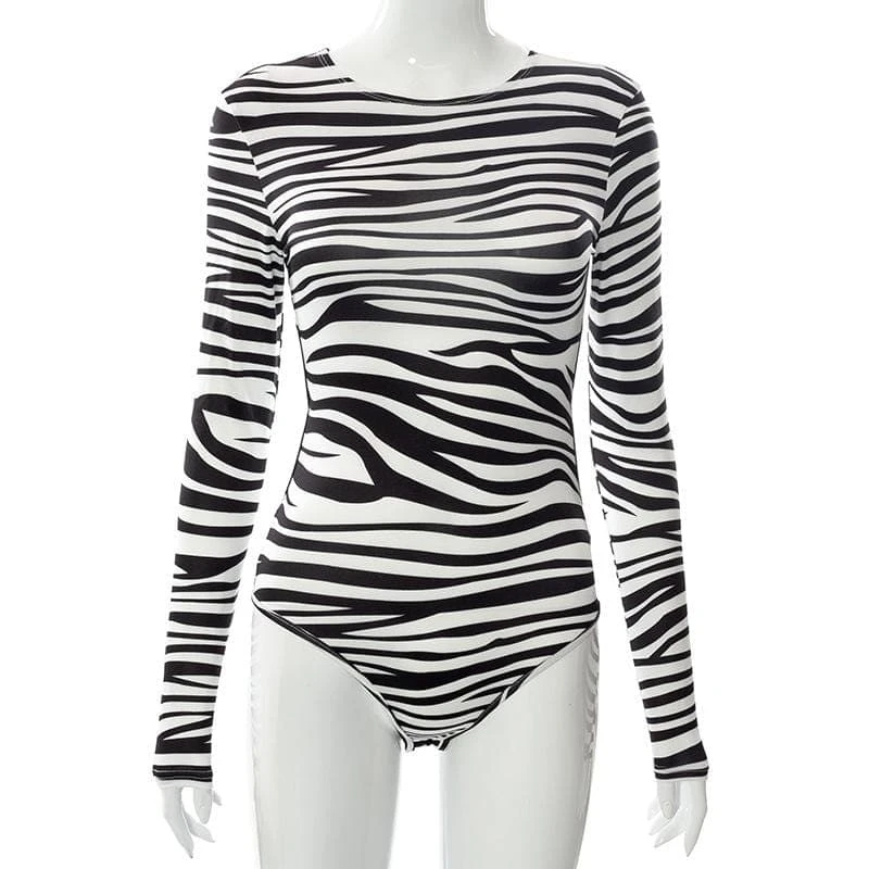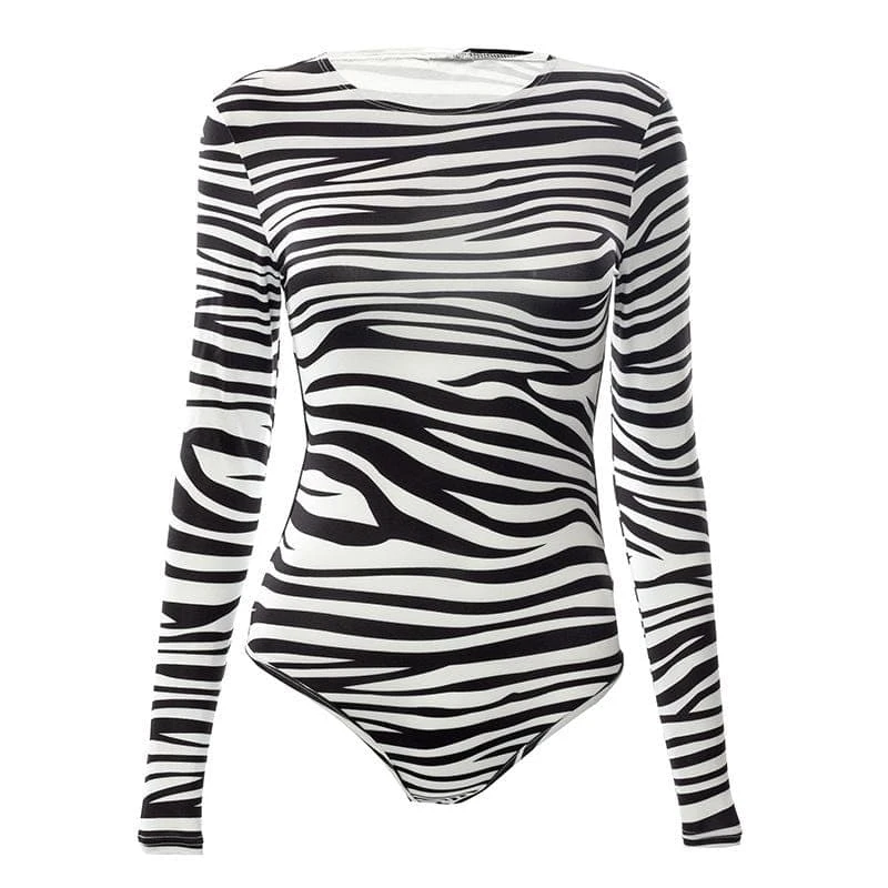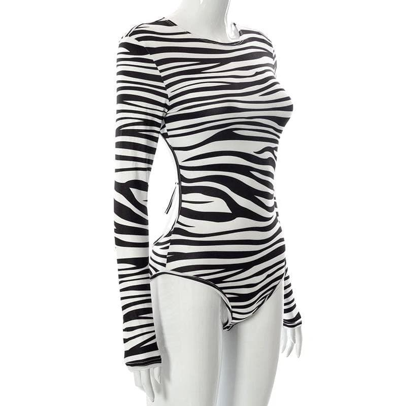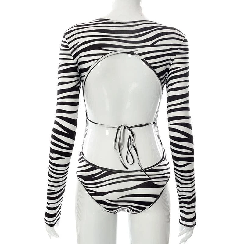 Add some fresh beast print to your wardrobe with our Nude Zebra Backless Bodysuit. In a large black and white zebra print design, this long sleeve bodysuit features a round neckline, stretch bodycon fit, and a backless tie design. Style with your fav jeans, biker boots, and for an edgy everyday look we are obsessed with.