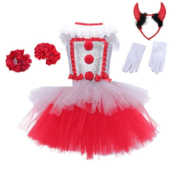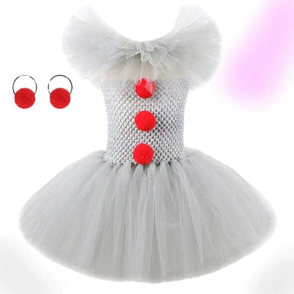 Time to float and have a scary good time with this Pennywise-inspired girl clown tutu costume. Once she’s all done up, she’ll be the cutest, creepiest, dancing clown around. This sparkly Clown costume has silver glitter and a stretchy top that will fit the child perfectly around the body. Layers and layers of White tulle have been used to create the super fluffy tutu skirt.