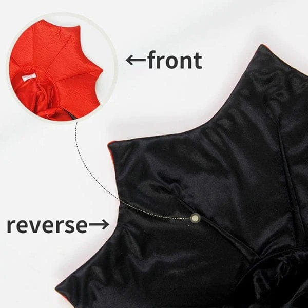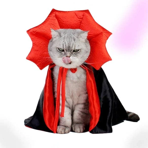 The pet vampire costume features a satiny bright red and black cape designed with an easy-to-use tie suitable for cats and small/medium-sized dogs.