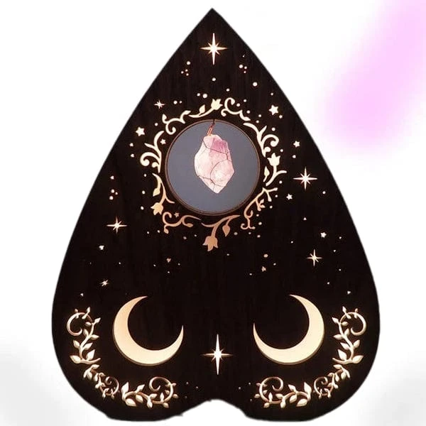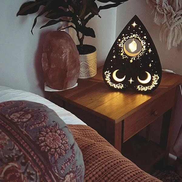 Get in touch with the spirits with this Ouija planchette lamp. The beautiful wooden planchette lamp is made out of wood with intricate botanical details and a starry night carved into the wood. The design is a magical way to add a bit of light and mystery to your home!