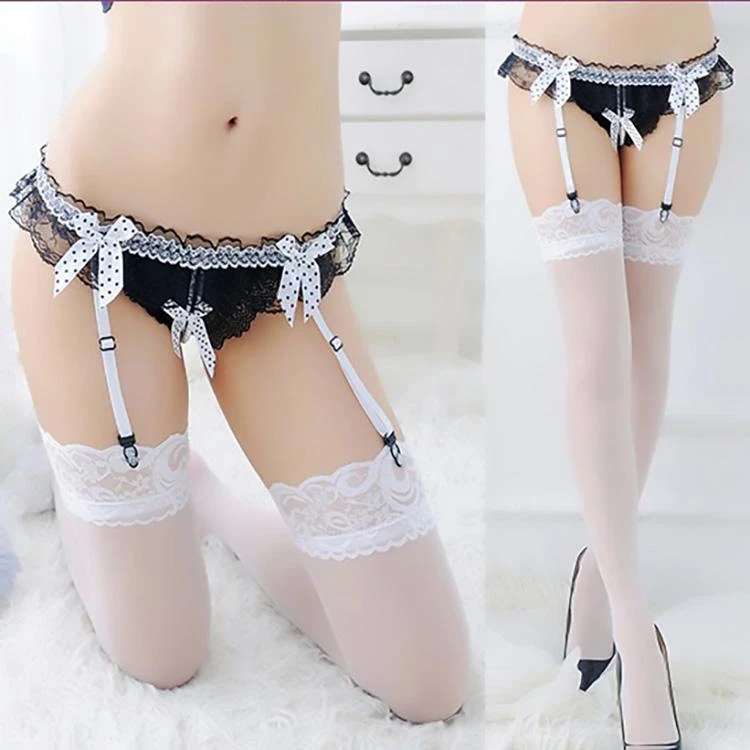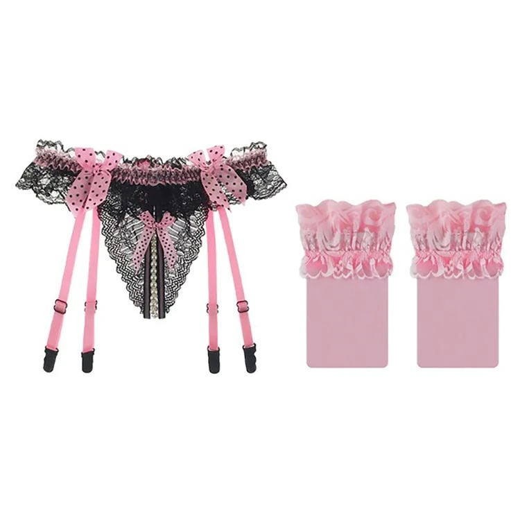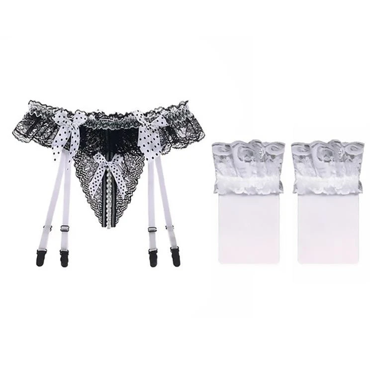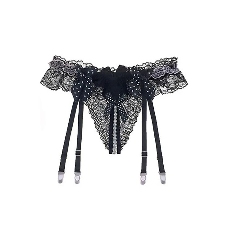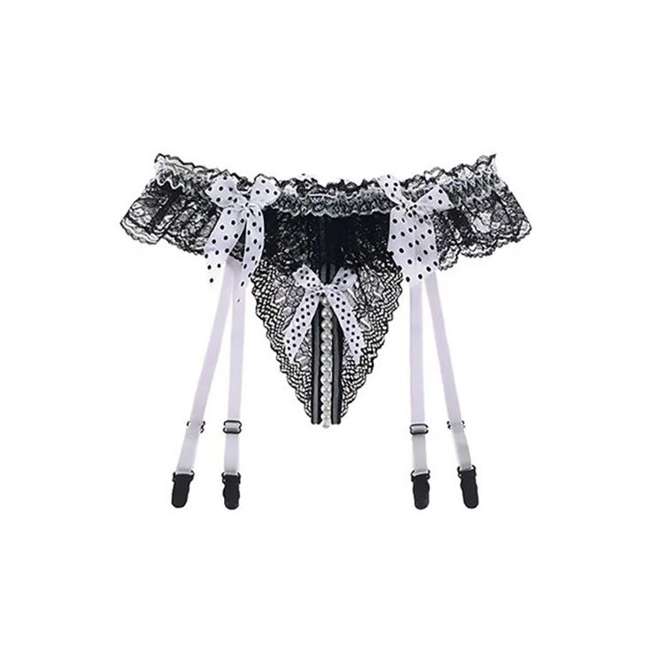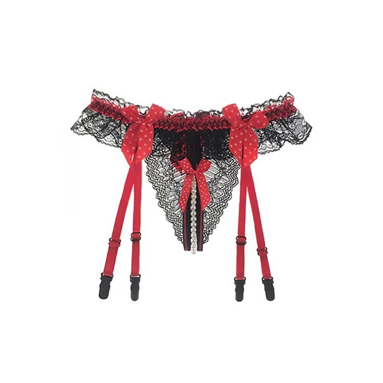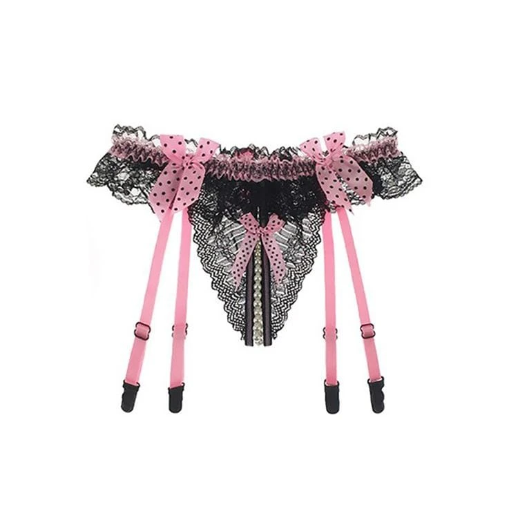 Dare ’em to come out in this Play with Me Thong, unless they’re scared bb! This sexy transparent thong features an open crotch G string design with a pearl chain in the bottom. It has a lace construction, lace edging, and has a suspender.