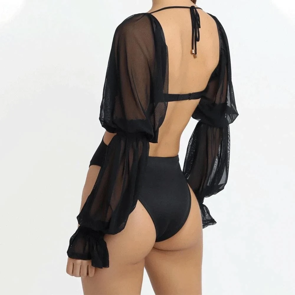 Spread your wings and take to the night sky in this bewitching bodycon bodysuit! Conjure some black magic with the mesh see-through long puff sleeves. Romance the night in the cold cut-out construct, designed to leave ’em spellbound. Complete with a skinny backless fit to invoke your vampiric brethren.Â