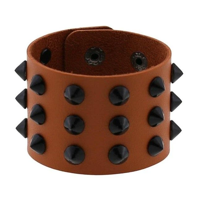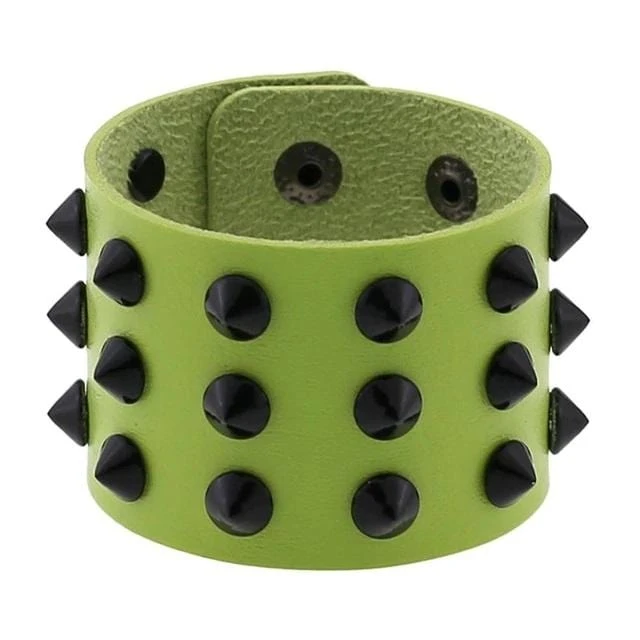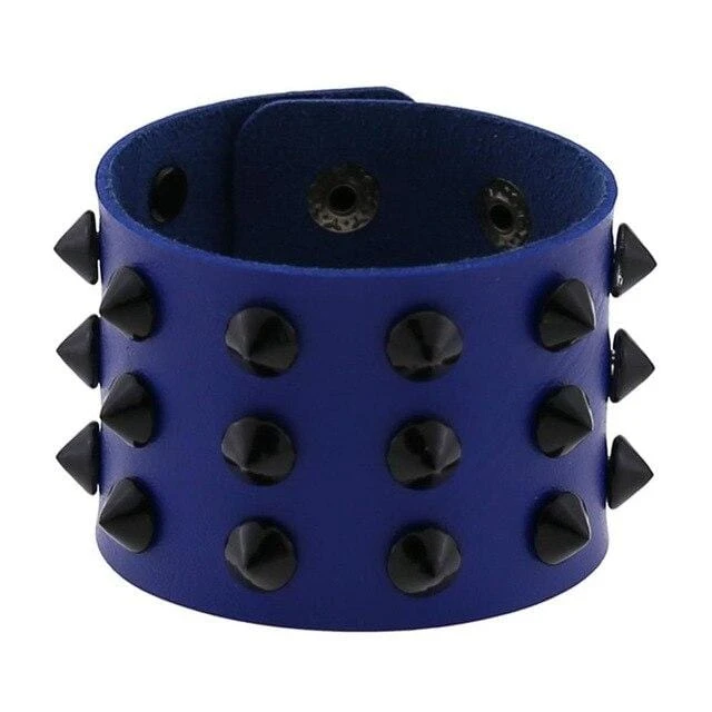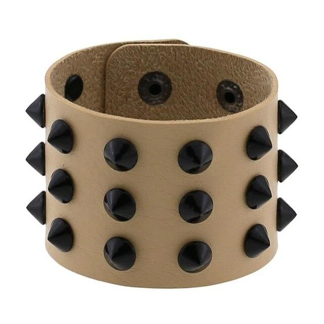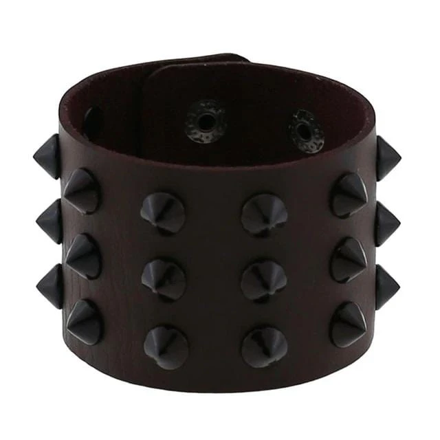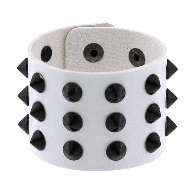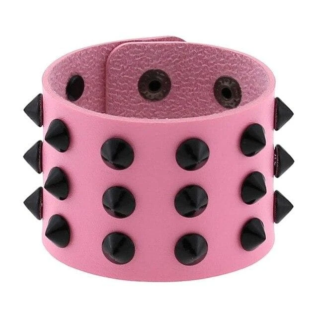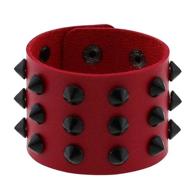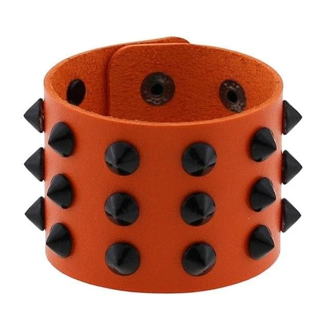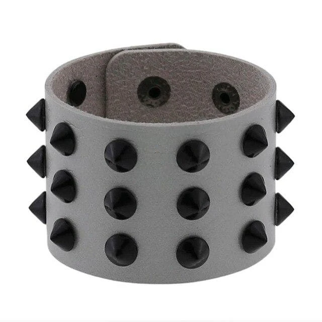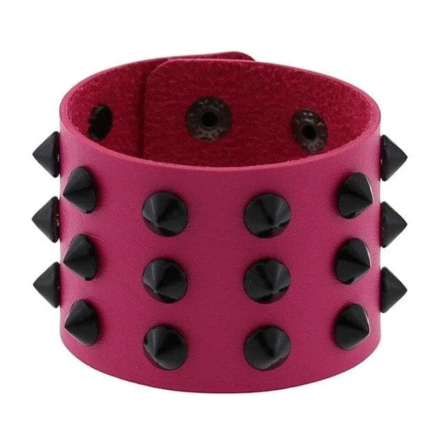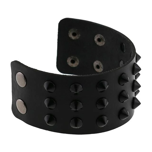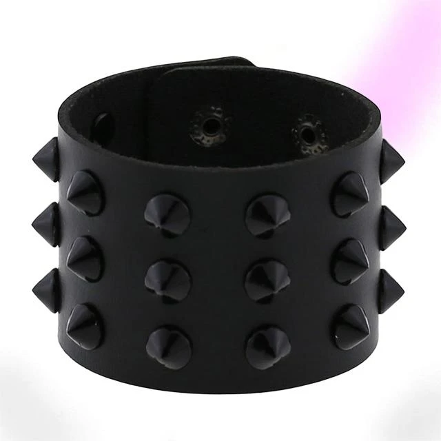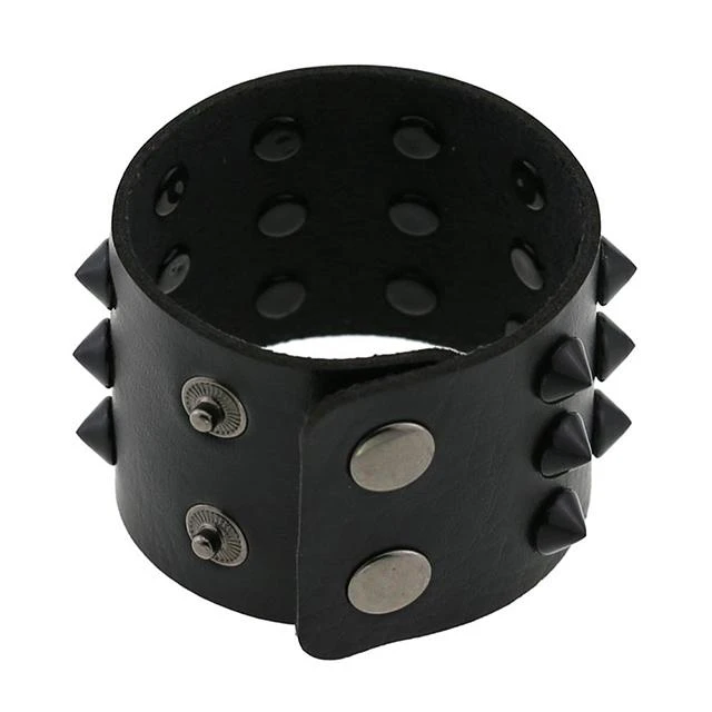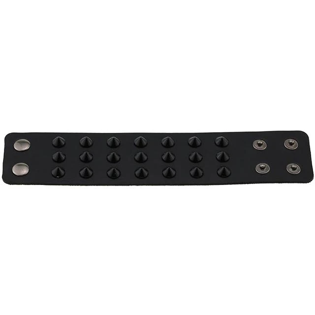 Evoke the divine energy with our faux leather punk spike wrist cuff; complete with a triple row spike rivet hardware statement and adjustable stud back.
