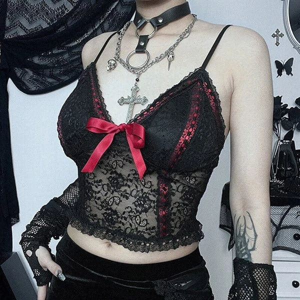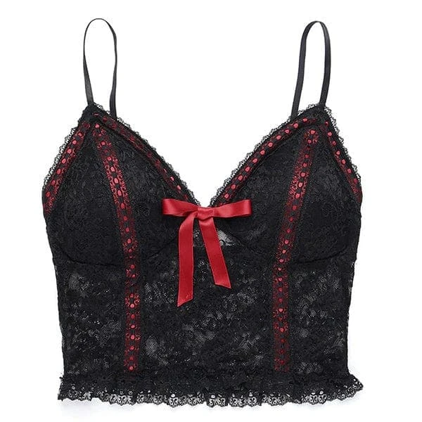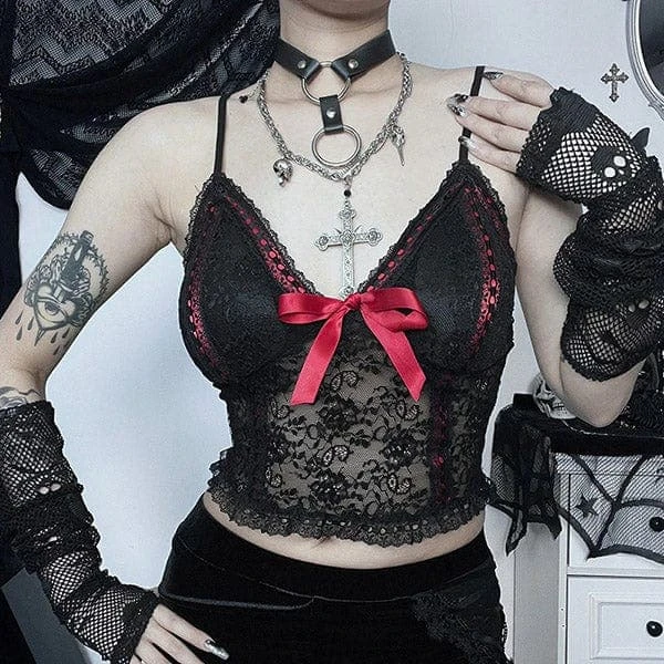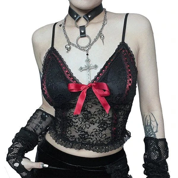 Introducing the Gothic Red Bow Lace Camisole Top – perfect for adding a sultry, gothic-inspired look to any outfit. This top combines Renaissance-style lace with an eye-catching red bow for an effortlessly unique look. A must-have for any modern-day fashionista! 🤩
