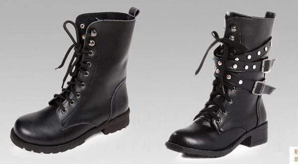 Our Reign Of Terror Boots cuz yer absolutely ruthless, bb. These gnarly boots feature a sleek black vegan leather construction, rounded toe, thick treaded soles, lace-ups, optional strappy harnesses details wrapped around tha ankle with buckles and studs cause why the hell not?