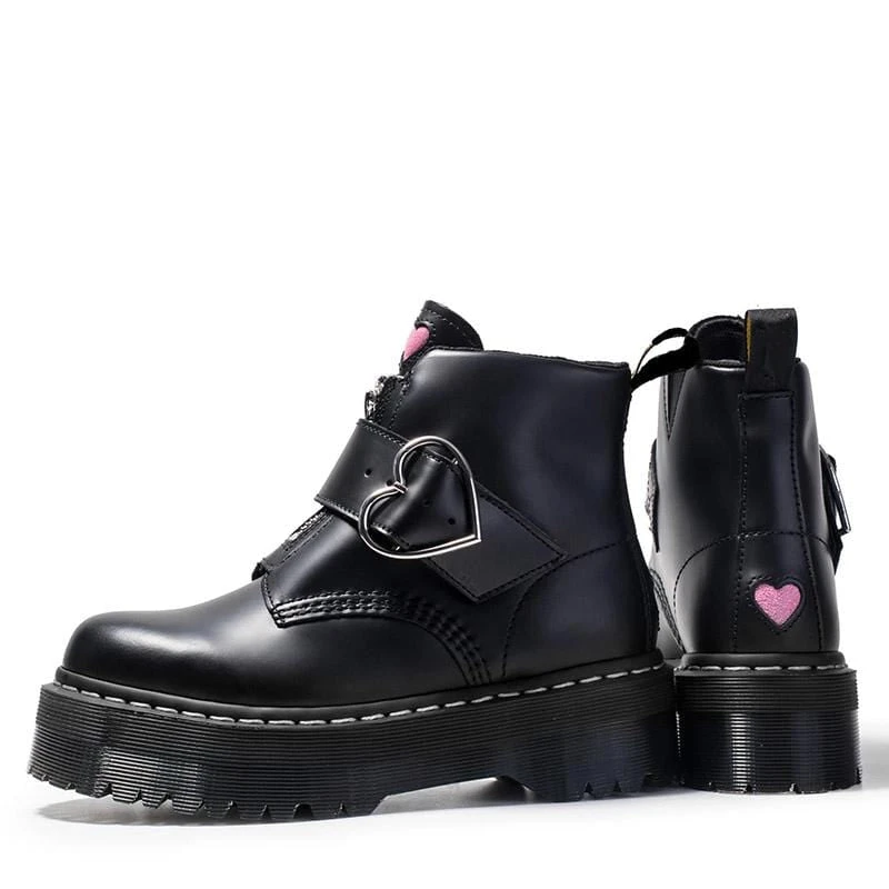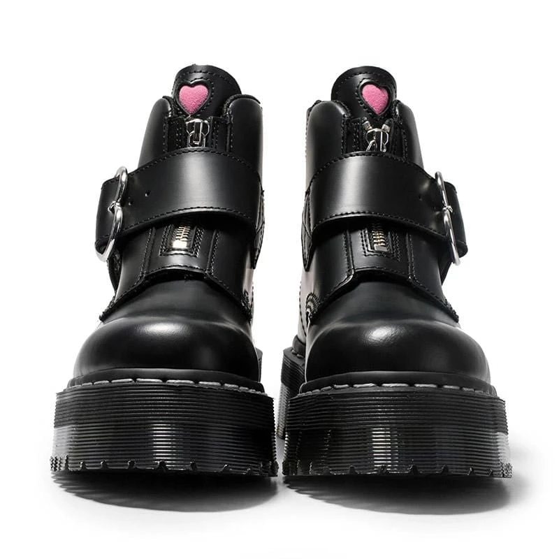 - One is a black boot designed with an adjustable metallic heart buckle strap on top of the zipper closing.