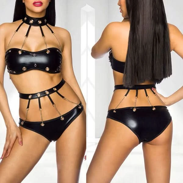 This daring faux leather lingerie set exudes dark, gothic allure, featuring sleek black leather with metallic accents and a provocative hollow-out design. Perfect for embracing your shadowy side, its choker-inspired neckline and edgy straps embody a bold, seductive aesthetic.