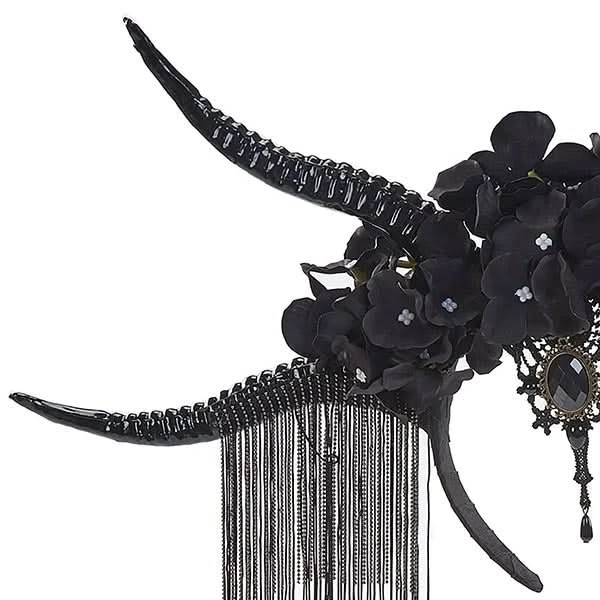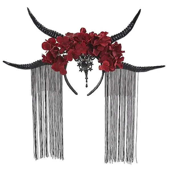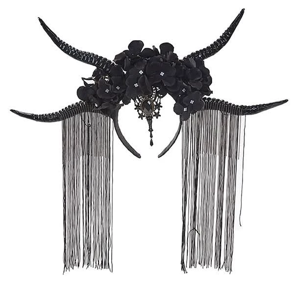 Introducing our new Shadow Witch Horn Headband, perfect for Halloween cosplay! Crafted with intricate detail, this headband features long ox horns measuring approximately 18cm in length, adorned with eerie tassels extending about 30cm. Embrace your dark side with this enchanting headdress, ideal for adding an edge to your witch or demon costume.