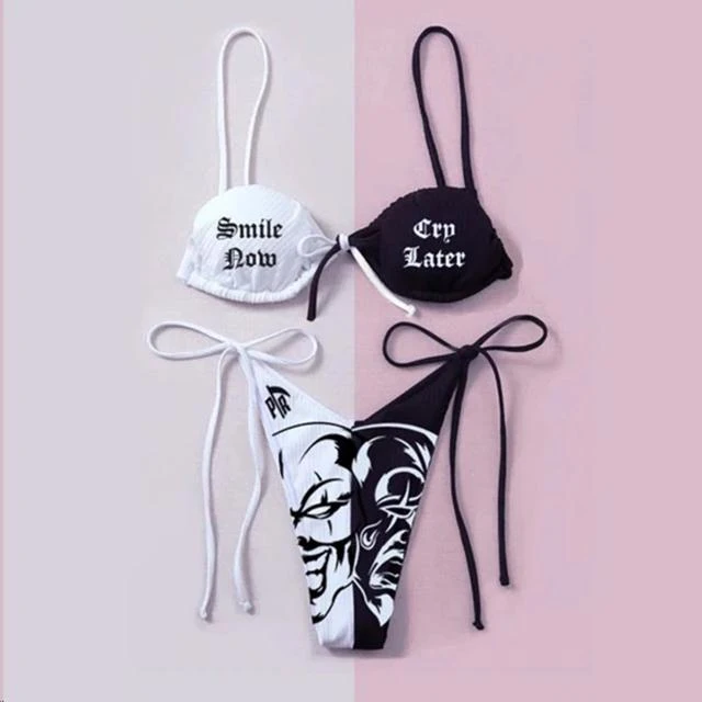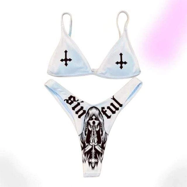 Always Walk On The Wild Side Of Life! Our ‘Sinful’ sexy swimwear oozes powerful sexiness! Complete with fitted soft-touch fabric with badass letter prints and triangle bottoms; this two-piece bikini set will keep heads turning! Be 100% badass at any beach or pool party!