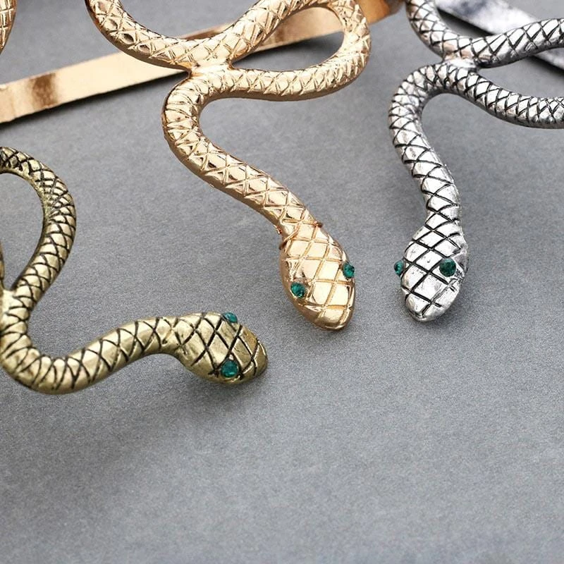 Sinful Snake Bracelets cuz it draws fear and fascination in equal measure. These striking bracelets weave itself hypnotically around the palm, creating a sense of movement and instant impact and interest. These bracelets feature tension settings and made with alloy type material.