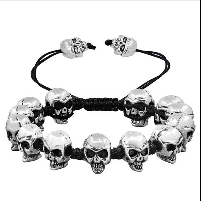 Do the universe a favor and don’t hide your magic; the Smiling Skull Vintage Bracelet will captivate you – combining silver-plated skulls with black rope. The perfect addition to any dark ghouls jewelry collection! Mix and match as your dark heart desires!