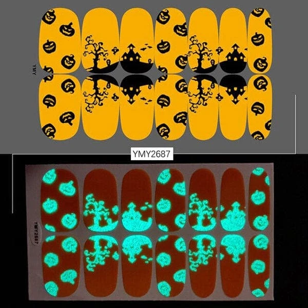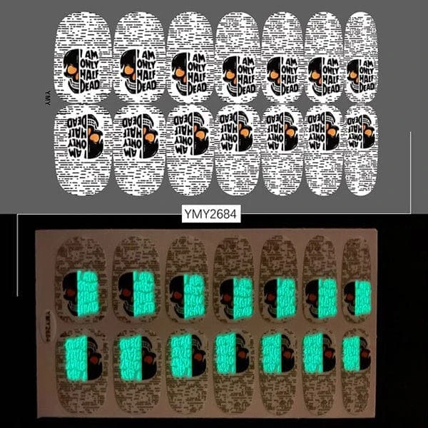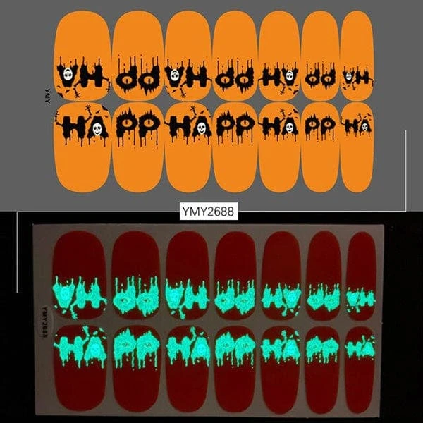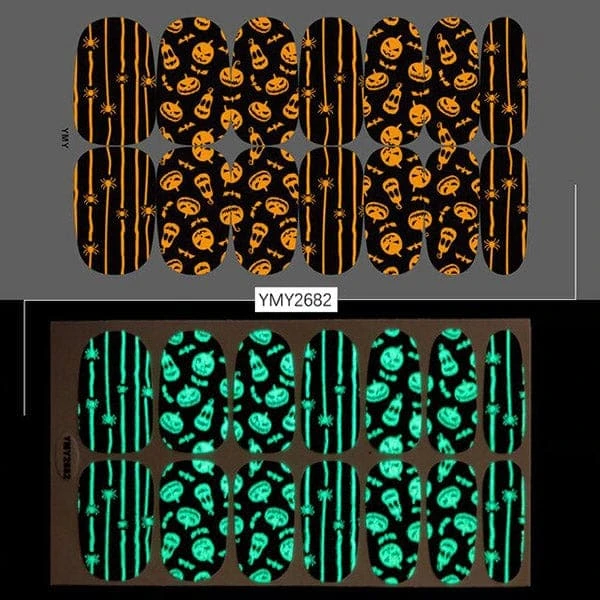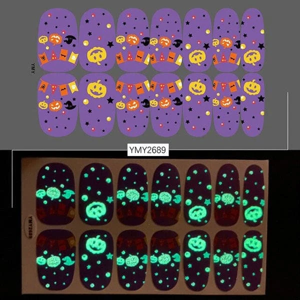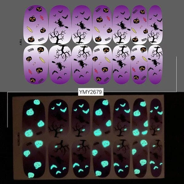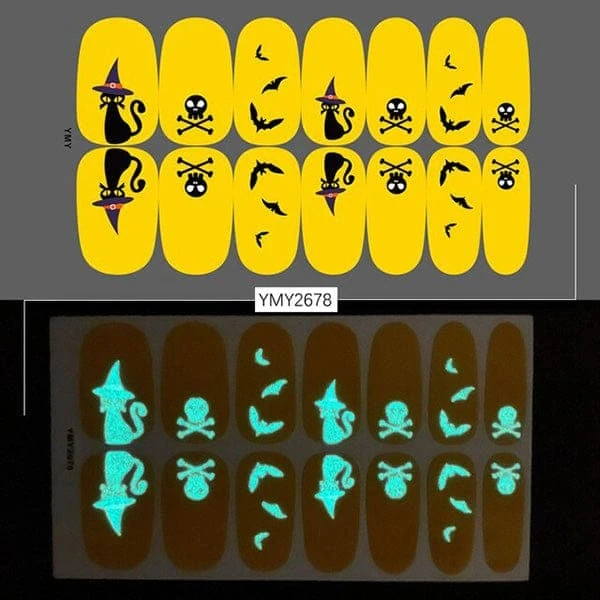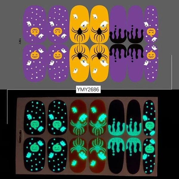 Do not let your nails down when your whole costume is on point. Here are many spooky, funky, and cute Halloween glow-in-the-dark nail stickers that you can find and match with your costume.