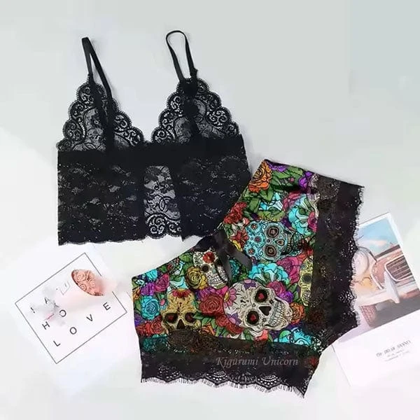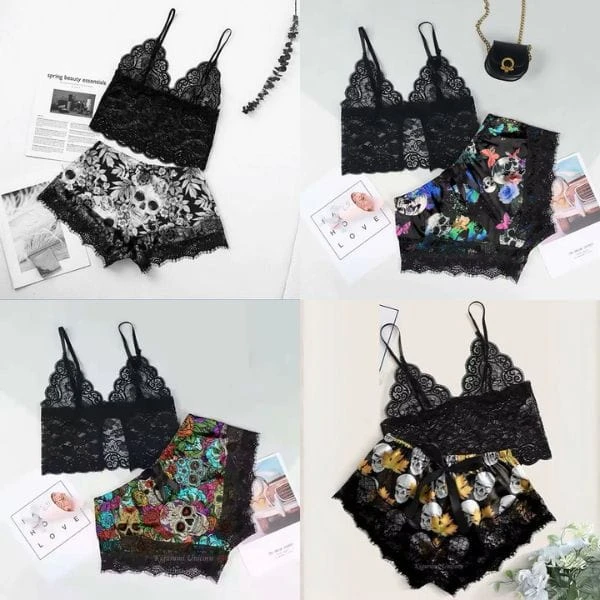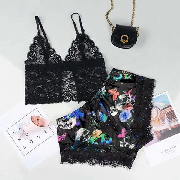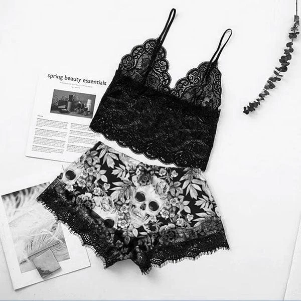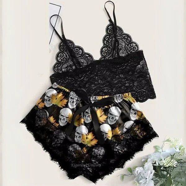 Sexy lace pajama set with a spooky skeleton print. Features a v-neck top and comfortable shorts. Perfect for Halloween or everyday lounging.