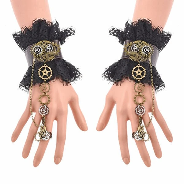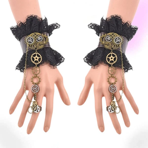 Set of two handmade faux leather and lace cuffs in black and brown will make you one of the most beautiful of the evening,. Decorated with gears, cogs and chains.