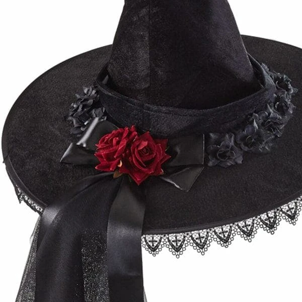 Bewitch your Halloween look with Theodora Witch Hat! This women’s witch hat features a wide brim and pointed top with roses & ribbons. Add a bit of magick and mystery to your Halloween costume and cast spells of style! (With a hat like this, you’ll be the most popular witch in town!)Â