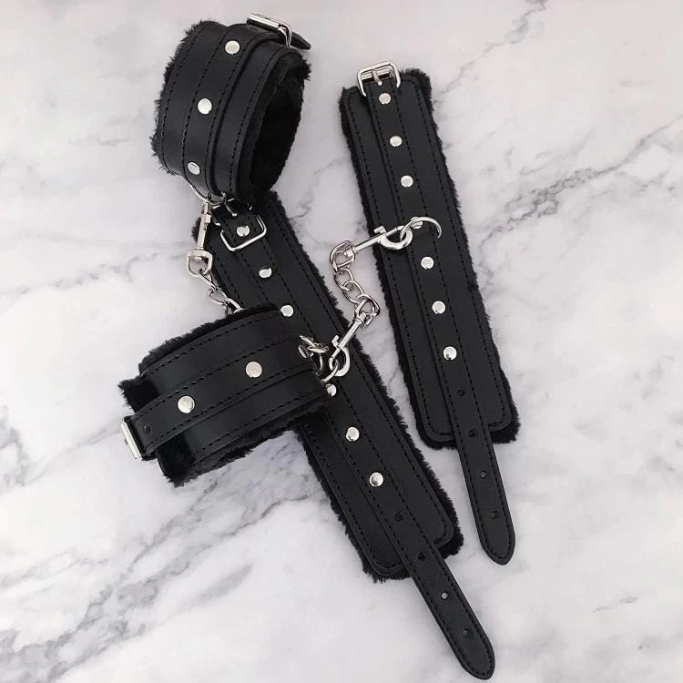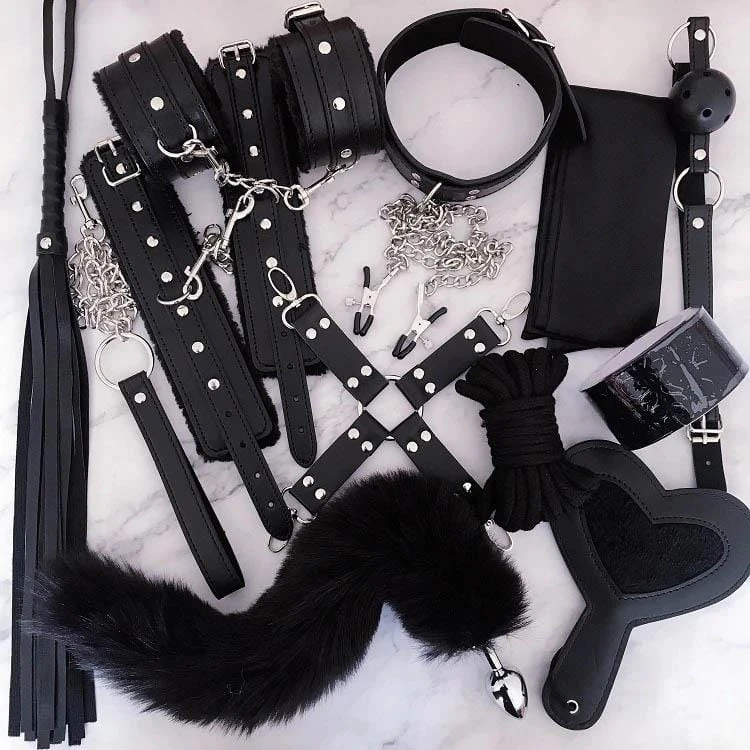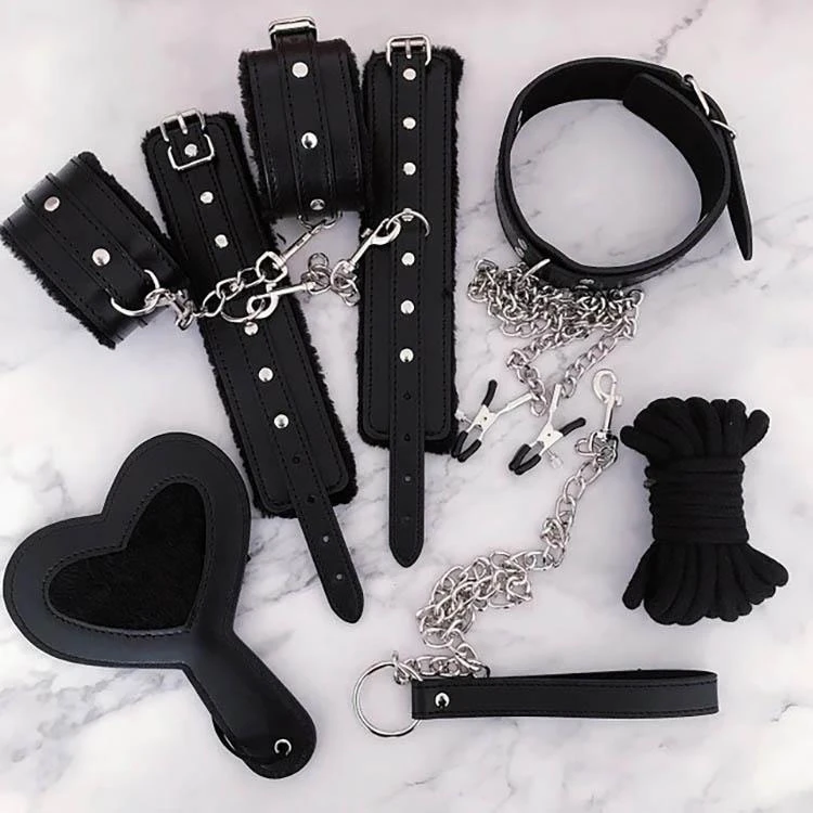 10pcs set: handcuffs + Ankle cuffs + collar nipple clamps + leash + 5m rope + tail plug + spanking + eyemask + cross link + mouth gag