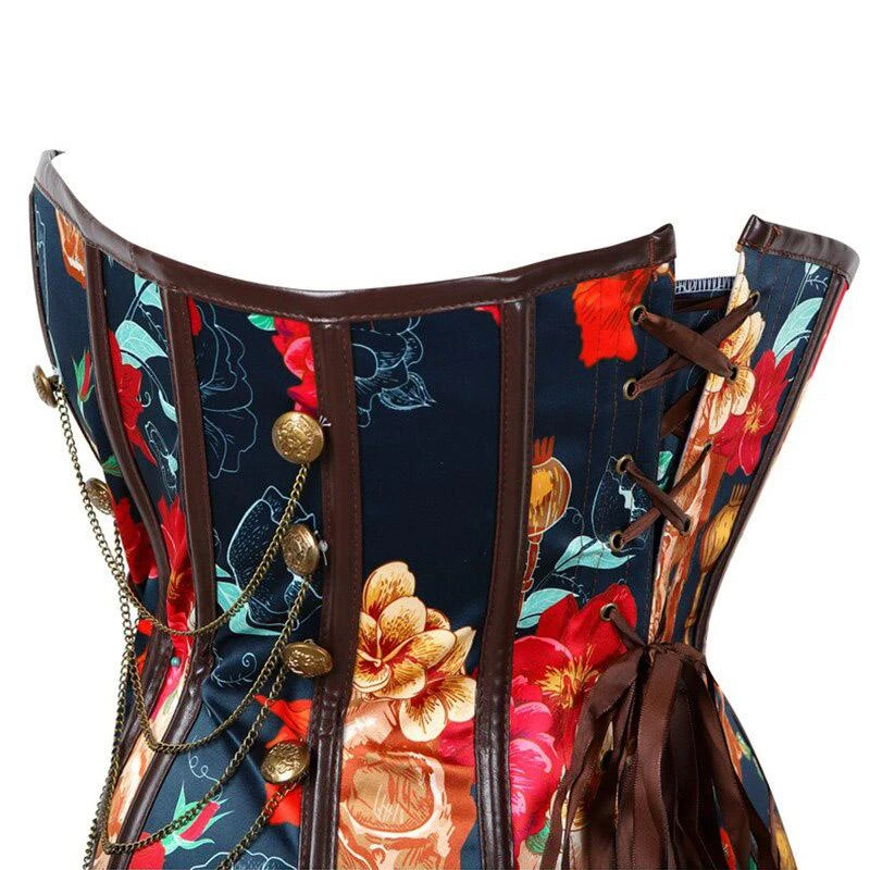 Vintage Punk Floral Corset cuz you’ll never go outta style. This push up overbust corset features its artistic floral print and link chains with buttons, it has a buckle hook closure type and lace-up tie at the back.