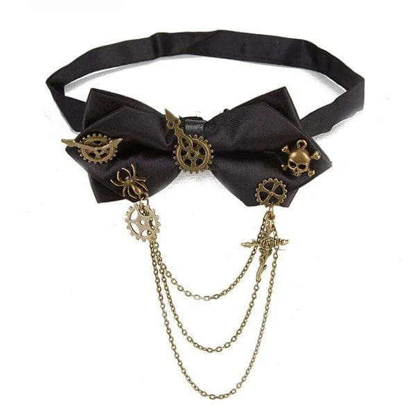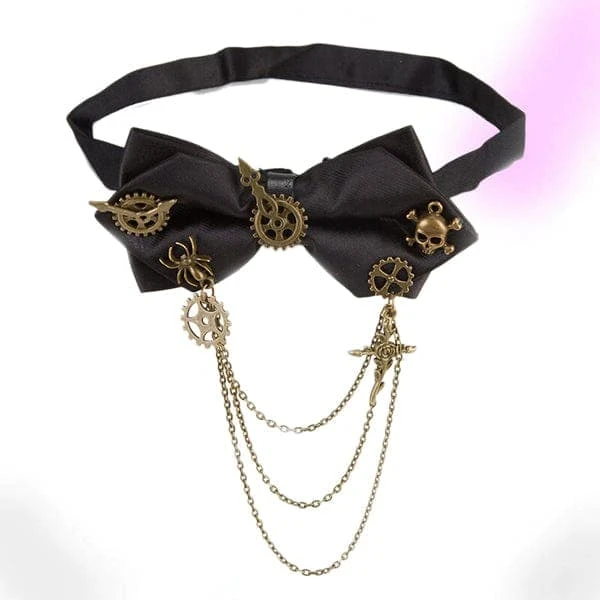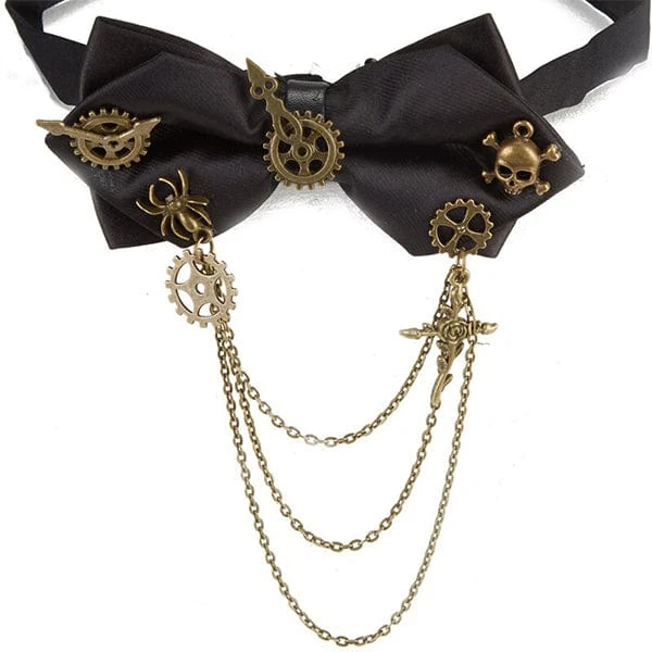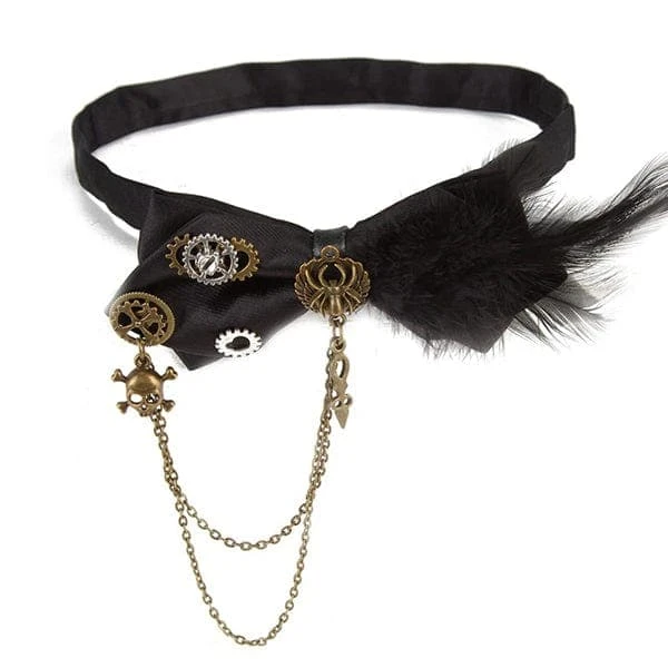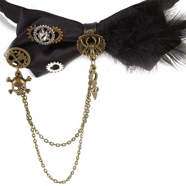 Finish your fancy costume or add a little steampunk style to your everyday clothes with this sophisticated and elegant aesthetic bow tie. Featuring chains, feathers, and cog detailing, it’ll make a great addition to any outfit.