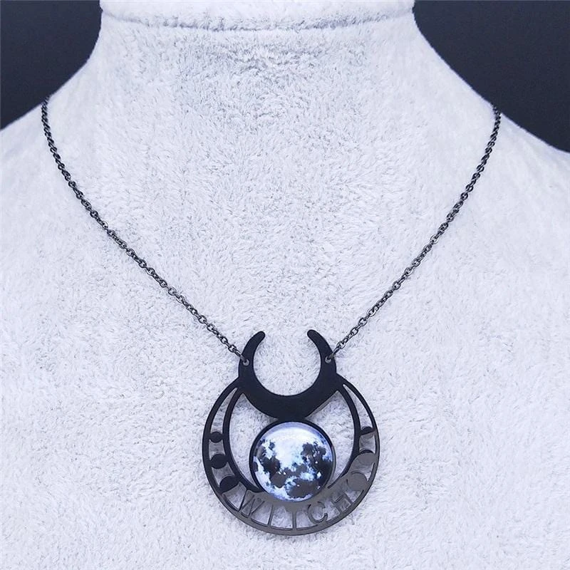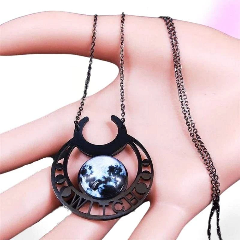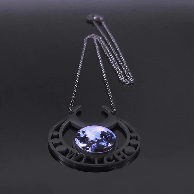 This darkly elegant moonglow necklace has a round pendant reminiscent of witch mourning jewelry. Featuring a 35mm moon pendant with a highly detailed black metal, it will make a great accessory for an alternative fashion or just add a subtle touch of an elegant goth outfit.
