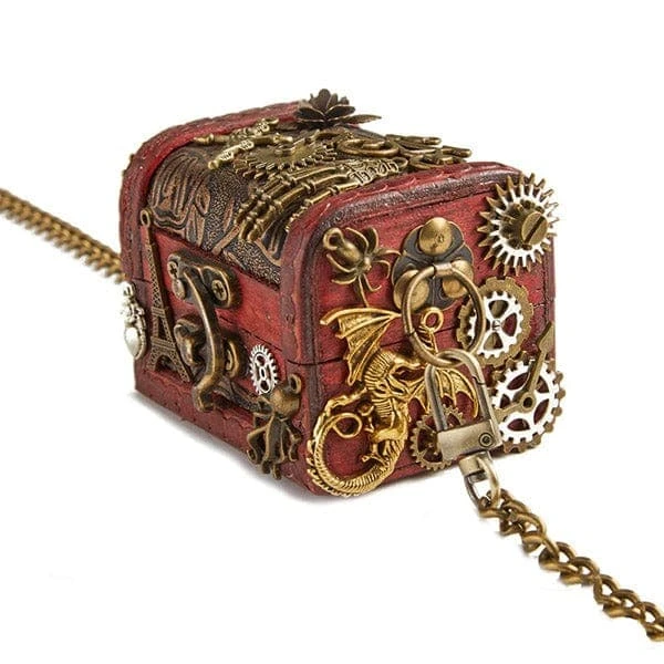 This unique steampunk mini bag comes in a square box, its sophisticated design is sure to grab a lot of attention. Made of wood and metal, with plenty of room for your coins and accessories.